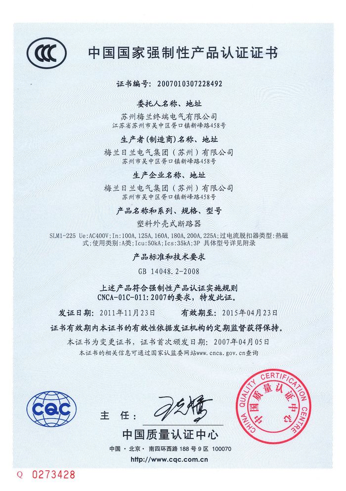 SLM1-225塑殼斷路器資質(zhì)證書(shū)