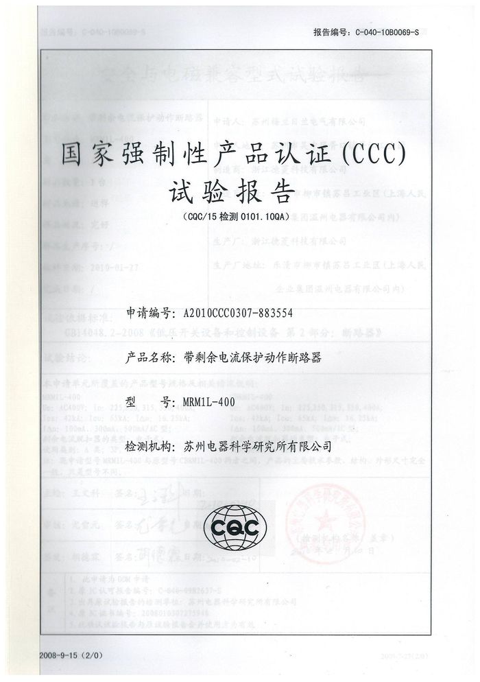 MRM1L-400塑殼漏電資質證書
