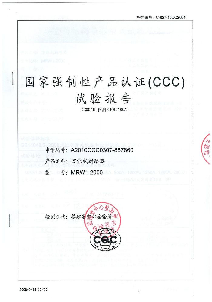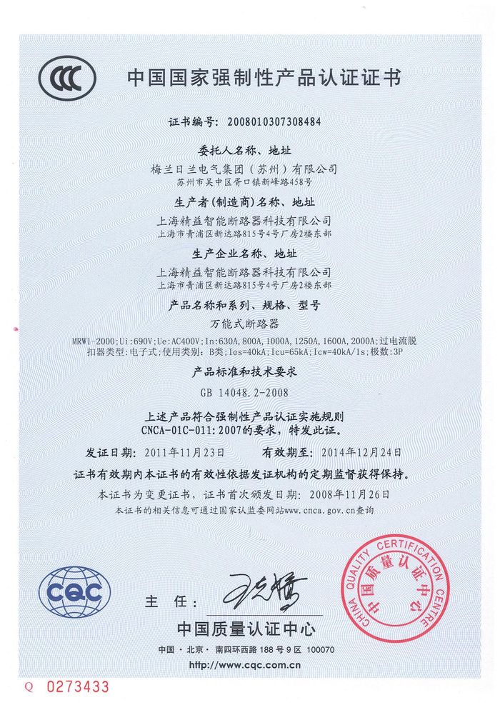 MRW1-2000萬能斷路器資質(zhì)證書