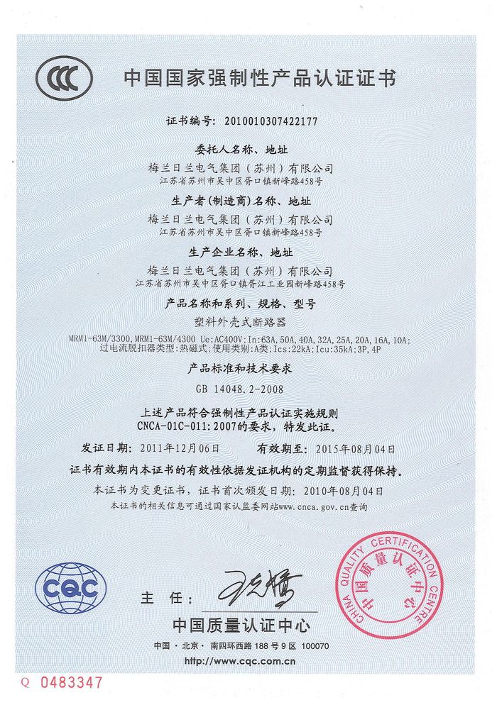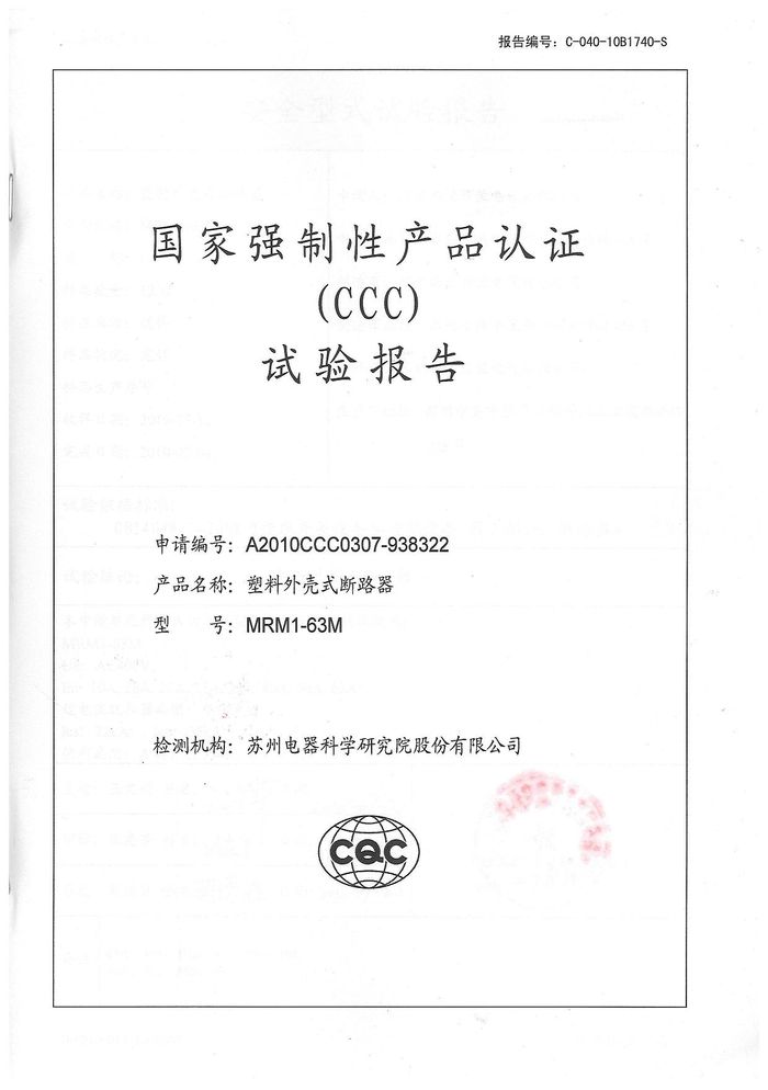 MRM1-63M塑殼斷路器資質(zhì)證書