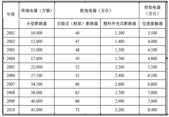 根據(jù)中國電器工業(yè)協(xié)會(huì)的統(tǒng)計(jì),2001 年至2010 年主要低壓電器產(chǎn)品的產(chǎn)銷量呈逐年上升趨勢(shì),低壓電器產(chǎn)品保持較快速度增長,終端電器、配電電器、控制電器產(chǎn)量復(fù)合增長率分別為18.19%、11.39%、10.22%,今后較長一段時(shí)間內(nèi)我國低壓電器市場(chǎng)容量仍會(huì)穩(wěn)步增長。