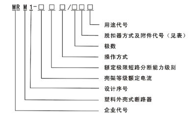 200:表示僅有電磁脫扣器的斷路器本體:300:表示帶有熱動一電磁脫扣器的斷路器本體;000:不帶脫扣器的斷路器本體;對MRMl-100、225=極產品只有21 0、31 0、220、320、230、330;對MRMl-63、1 00及MRMl-225四極斷路器、N極為A型和D型中無240、340、260、360、218、318、248、348、268、368;
