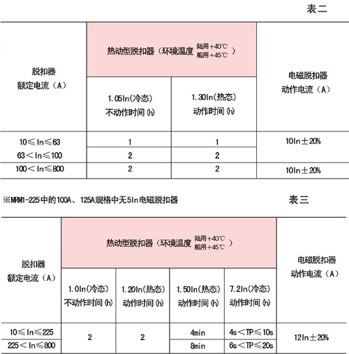 斷路器熱動型脫扣器具有反時限特性;電磁脫扣器為瞬時動作,特性見表二(配電用)及表三(保護電動機用)