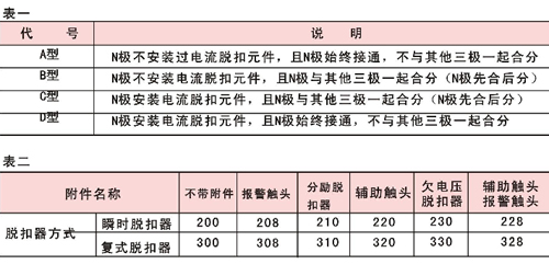 注:1)配電用斷路器無(wú)代號(hào),電動(dòng)機(jī)保護(hù)用斷路器以2表示。