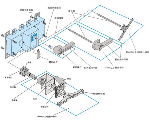 手柄可直接裝在開(kāi)關(guān)上操作(簡(jiǎn)稱(chēng)柜內(nèi)操作),也可通過(guò)加長(zhǎng)軸在配電柜門(mén)外操作(簡(jiǎn)稱(chēng)柜外操作),提供操作方便。